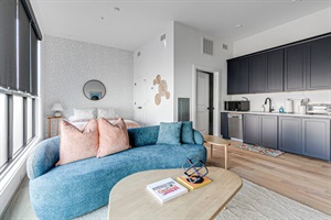 Chic Studio Retreat: Vibrant sofa, sleek kitchen, and gentle light for an inviting stay!